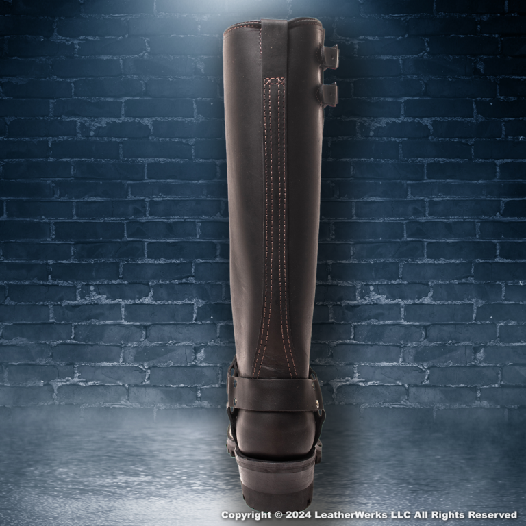 Thick leather layers cater to leathermen and motorcyclists. A steel shank absorbs shock and blocks punctures. Two top straps grip your calves, and a harness strap locks around your ankle. You ride hard, and the boots stay tight.